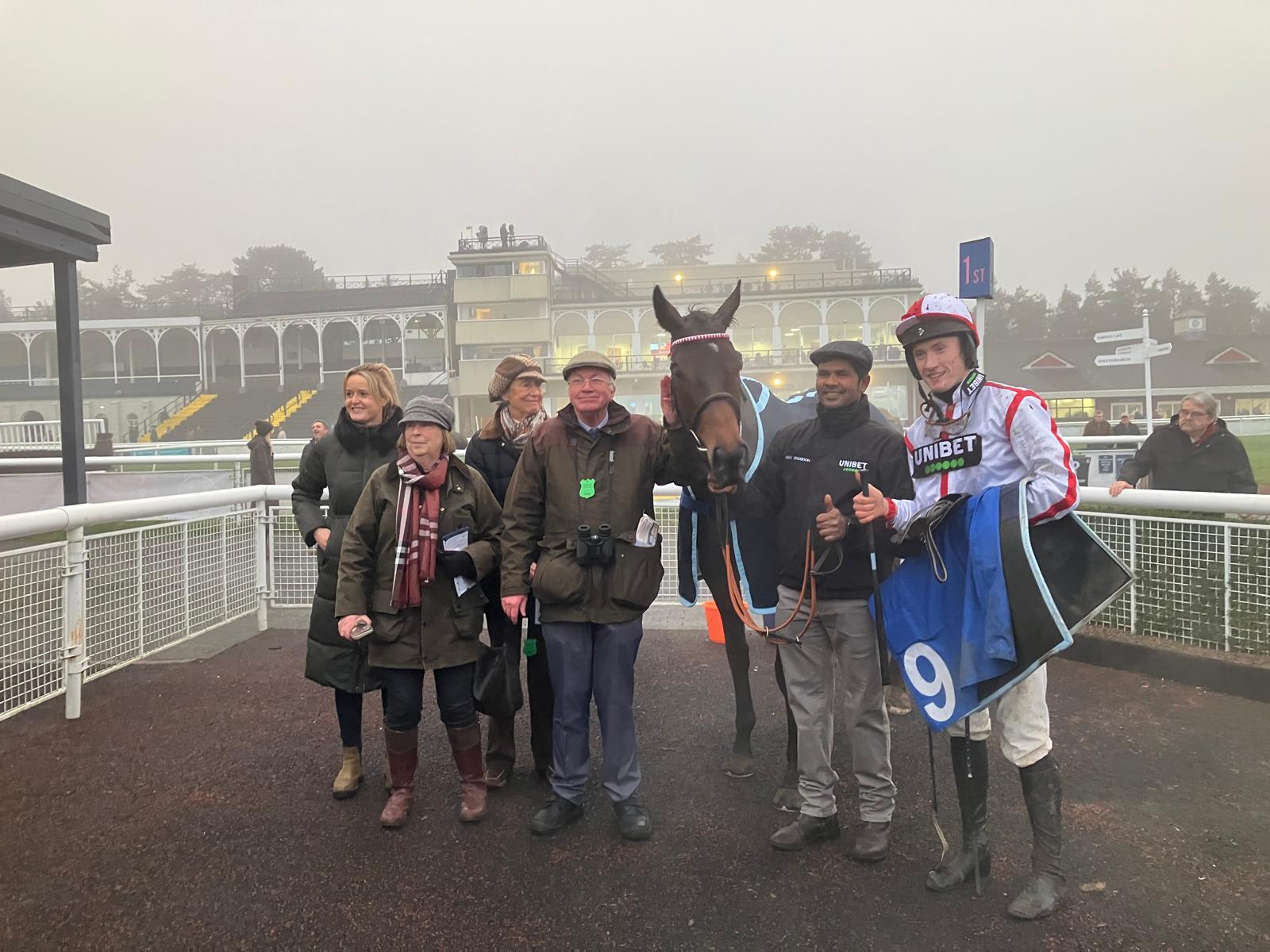 Aston Martini looked in fabulous shape ahead of the Mares’ Novices Hurdle at Lingfield’s Winter Million Festival on Sunday 21st January. She ran a great race in a competitive Class 2 event under a good ride from James Bowen and despite being headed in the final half furlong, she fought back to win by a nose in a photo finish, to make it a third win from just three runs. An exciting moment for her owners present. However, then came the sting – there was a slight coming together and bump between Aston Martini and the second horse and following a lengthy Stewards’ Enquiry, the result was reversed with Aston Martini being placed second. The ups and downs of racing were certainly experienced all in the space of half an hour!